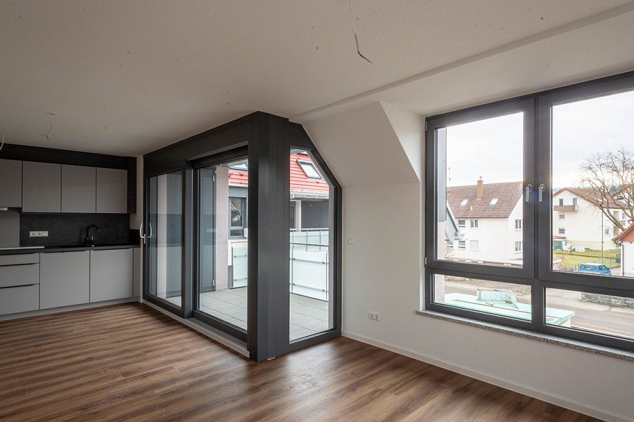 Die Dachgeschoss-Wohnung verfügt über einen lichtdurchfluteten Wohn-/ Essbereich mit offener und geschmackvoller Einbauküche, welche mit Herd, Backofen, Geschirrspüler, Kühl-Gefrierkombination und Mikrowelle ausgestattet ist. Von dort erreichen Sie den Balkon mit abschließbarem Stauraum. Das freundliche Tageslichtbad verfügt über eine Badewanne, eine Dusche, ein Waschbecken und ein WC. Angrenzend befindet sich das Schlafzimmer, sowie ein weiteres Zimmer für die individuelle Nutzung. Um den Komfort innerhalb der Wohnung abzurunden, sind selbstverständlich ein separates Gäste-WC, sowie eine Fußbodenheizung vorhanden. Im Untergeschoss des Hauses befindet sich ein Waschraum mit Anschlüssen für Waschmaschine und Wäschetrockner, sowie Gemeinschaftsräume für Kinderwägen und Fahrräder.