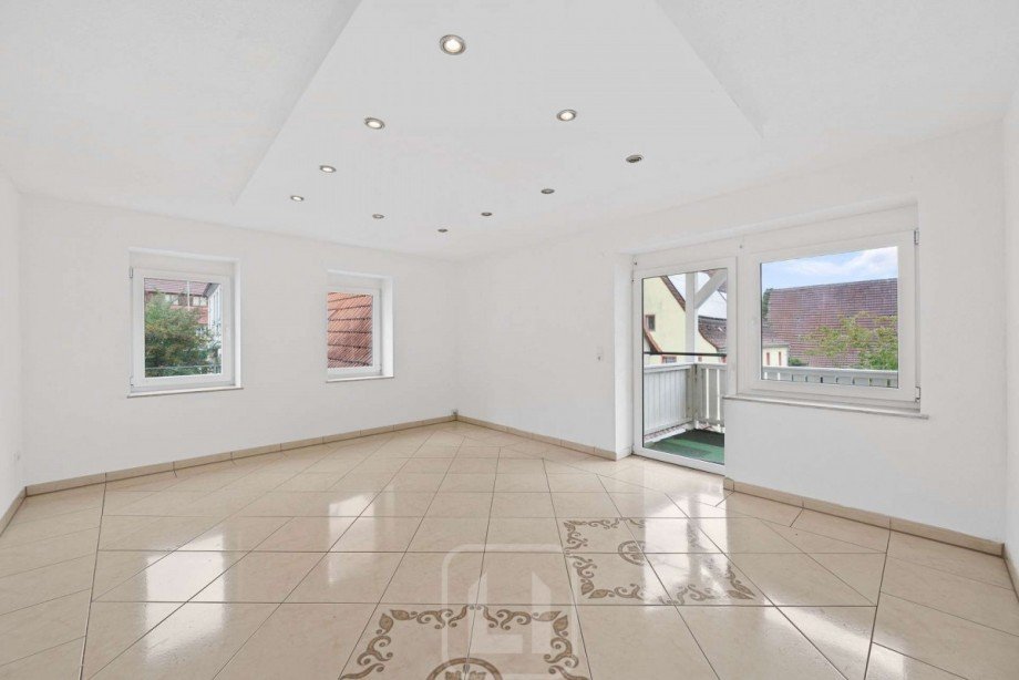 Das Wohnzimmer ist ein eigenständiger Raum mit einer abgehängten Decke und integrierten Deckenstrahlern, die ein angenehmes, warmes Licht erzeugen. Von hier aus betreten Sie den zweiten, überdachten Balkon - ein geschützter Ort für Ruhe und Rückzug bei jedem Wetter.